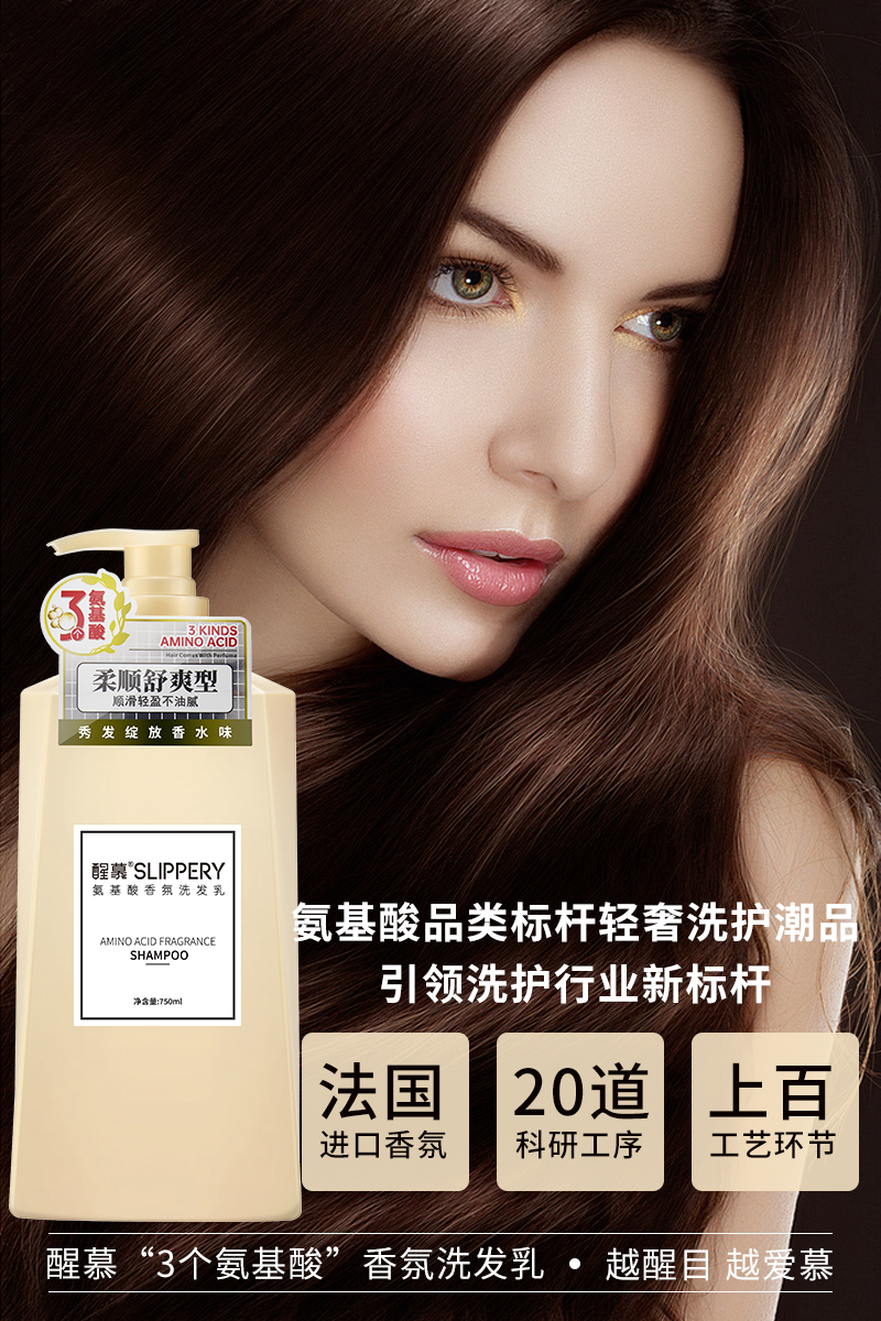 醒慕三个氨 基酸成分有效添加,不做概念性添加,三者之间相互作用,形成我们头发的主要营养补给,越洗越顺,越洗越滑,越洗越亮!清洗后,头发柔顺不容易打结,而且发根蓬松、不贴皮,让小姐姐们的秀发润而不腻,柔而不油。洗发水还融入了花果香氛的香甜气息,拥有和大牌香水一样的前中后调,让你的秀发更显清新怡人。